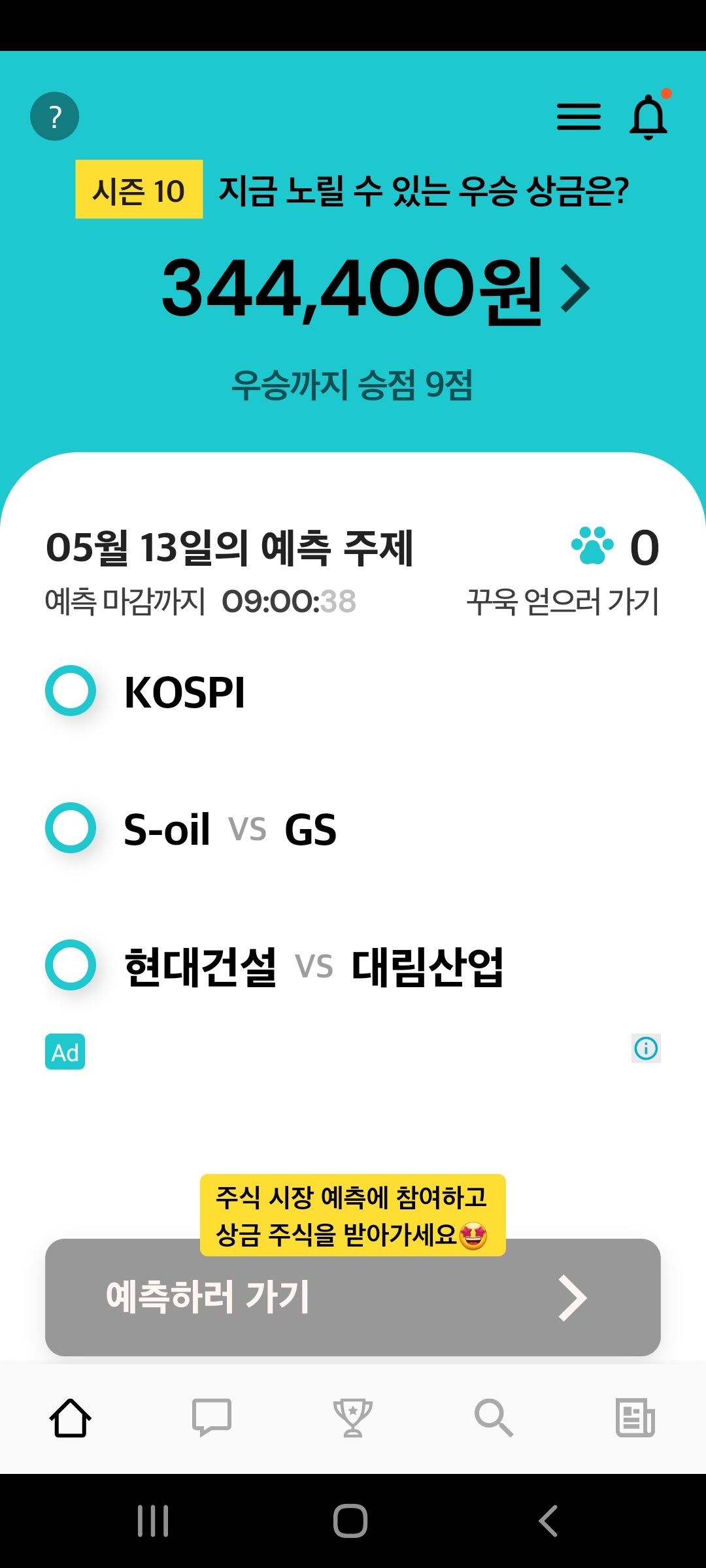 누구나 참여 가능한 주식예측 퀴즈앱! 꾸욱 눌러서 예측하고 주식받자!
