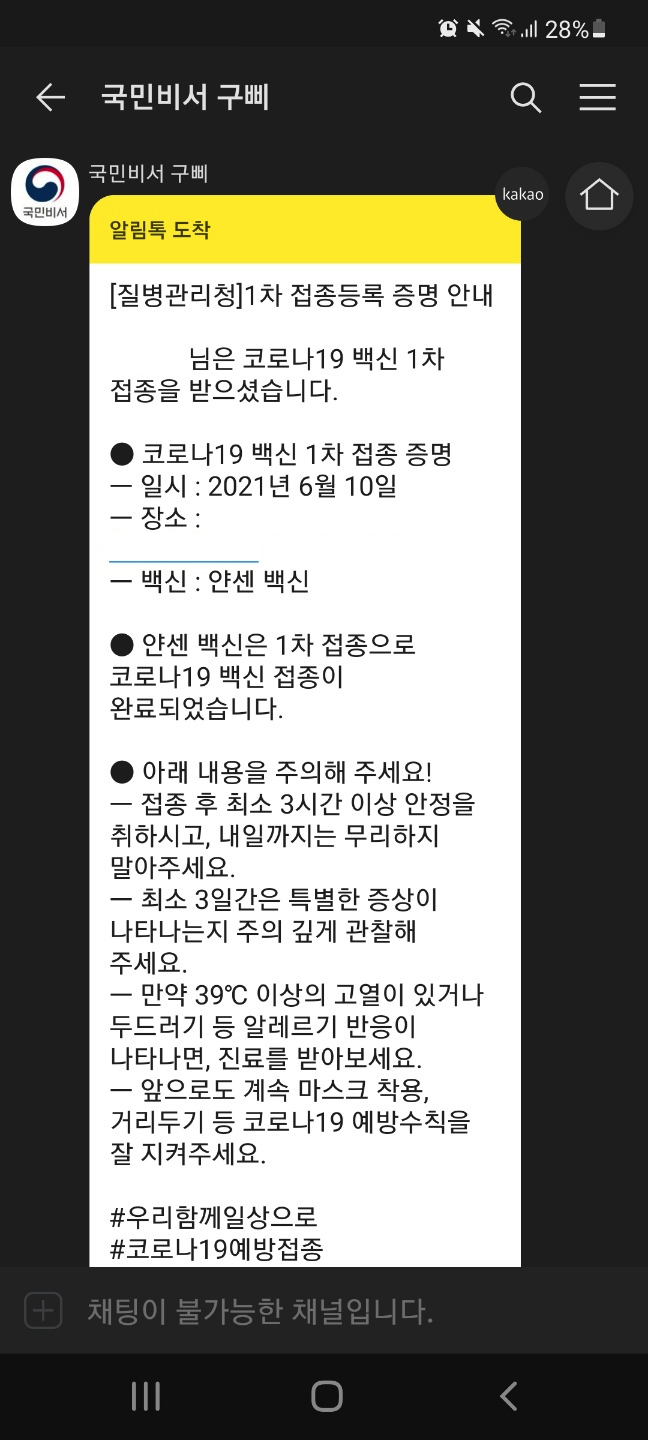 20분 정도 대기하였고 주사 맞은 부분이 약간 빨갛게 부었습니다. 보여주며 여쭤보니 한 시간 정도 계속 지속되면 건드리지 말고 병원으로 연락하라고 하셨습니다. 다행히 주사 맞은 부분은 정상으로 돌아왔습니다. 프린트 된 접종 확인서도 요청하여 받았고 카톡으로도 다음처럼 확인 받았습니다.