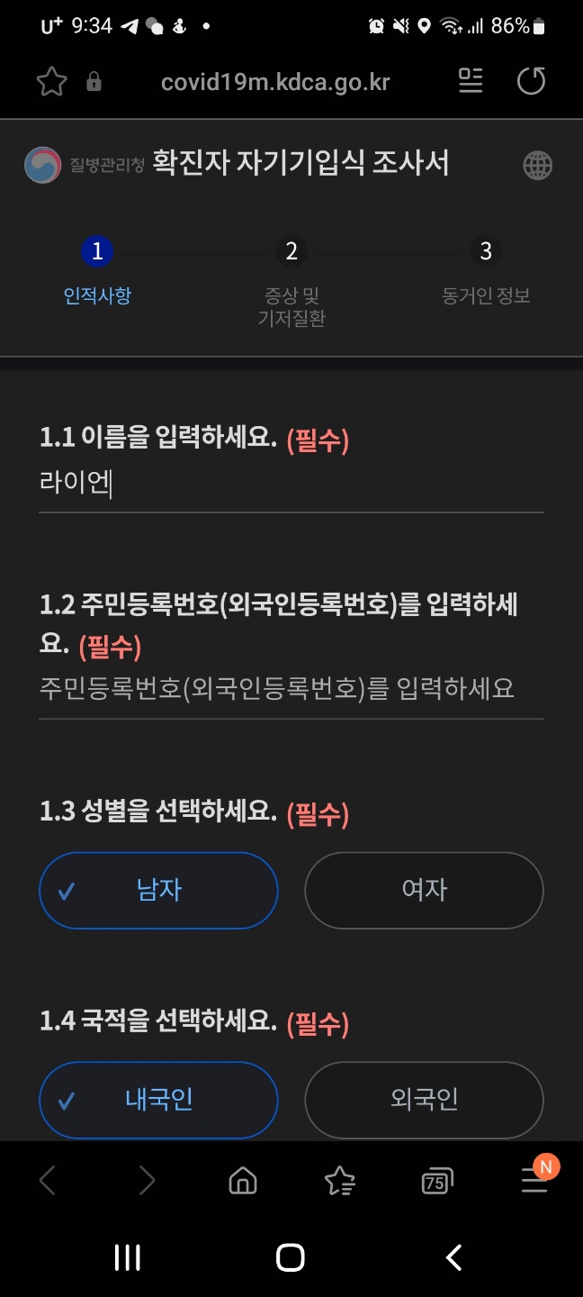 위에 확진자 자기기입식 조사서를 제출하였습니다.