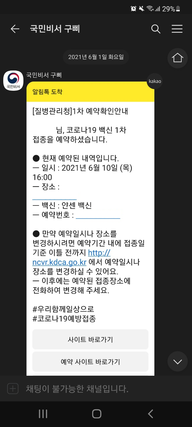 20분 정도 대기하였고 주사 맞은 부분이 약간 빨갛게 부었습니다. 보여주며 여쭤보니 한 시간 정도 계속 지속되면 건드리지 말고 병원으로 연락하라고 하셨습니다. 다행히 주사 맞은 부분은 정상으로 돌아왔습니다. 프린트 된 접종 확인서도 요청하여 받았고 카톡으로도 다음처럼 확인 받았습니다.